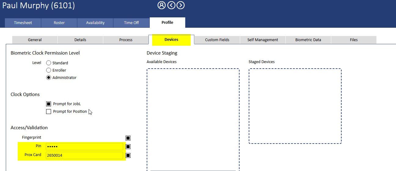 - If you manually set the PIN or Prox card fields on the Employee Profile the timeclocks will be updated for that employee.