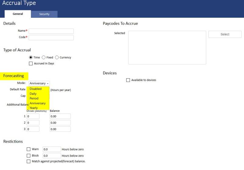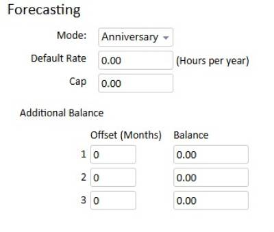 Configure the forecast calculations for each accrual type. There are four options -