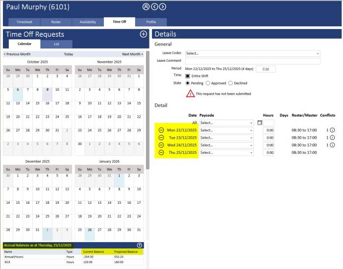 Once you have selected the dates for the time off request the projected accrual balances will be calculated and displayed.