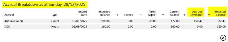 The projected accrual balances will display in the detail of the accrual totals on the right of the screen. The project balance will be calculated on the timesheet period currently open.